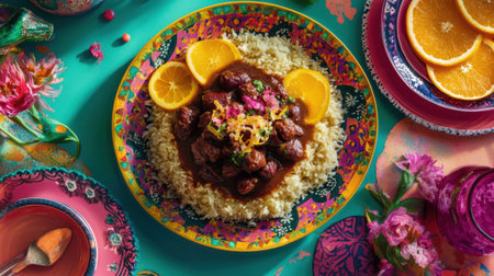 A vibrant and artistic presentation of a flavorful meat dish served over rice, garnished with citrus slices, flowers, and colorful tableware.