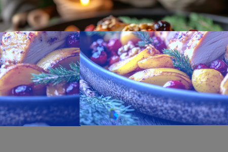 Roasted chicken breast with cranberries, walnuts and potatoes.