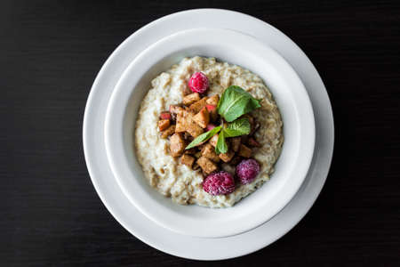 European international fusion cuisine, a beautiful dish on a white plate decorated with herbs and vegetables. a professional chef has prepared a delicious meal. Vegetarian food and meat restaurant dishes. fast food.