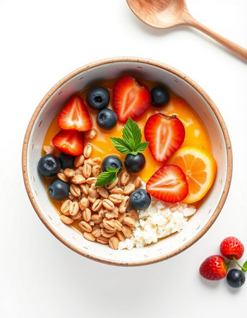 Healthy breakfast. Oatmeal with yogurt, berries and fruits in a bowl on a white background.
