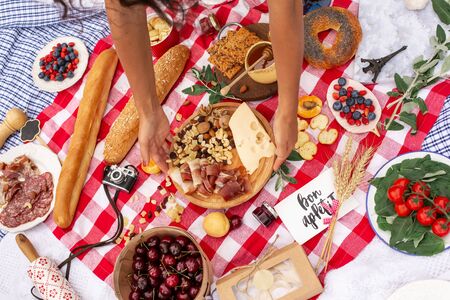 Woman hold plate with parma and cheese. Summer outdoor picnic.