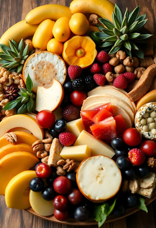 A visually appealing platter showcasing a balanced meal with various colorful fruits, vegetables, proteins, and nuts.