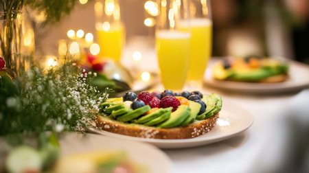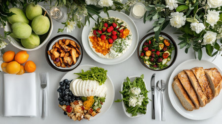 A beautifully arranged gourmet breakfast spread featuring fresh fruits, salads, and bread