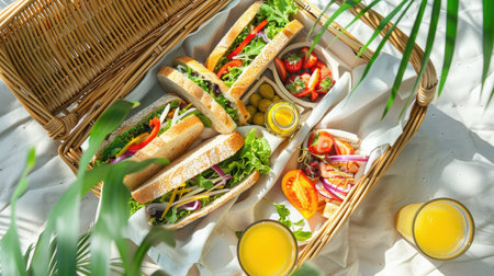 Enjoy a vibrant picnic scene featuring sandwiches, fresh fruits, and drinks, beautifully arranged on a cozy blanket surrounded by blooming flowers and greenery.