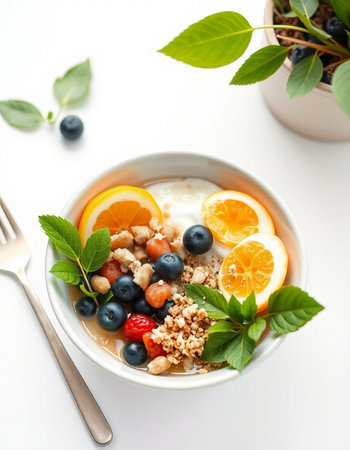 Healthy breakfast bowl with yogurt, berries and granola on white background