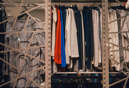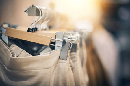 Shopping in store. Clothes on hangers in shop for sale. Blur background. Fashionable clothes in a boutique. Various clothing on market.