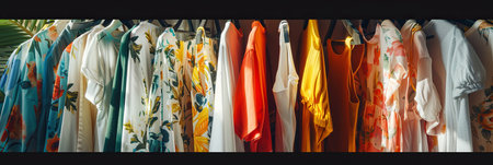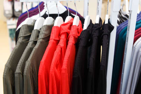 Various shirts in different colors and styles hanging on a rack in a fashionable womens closet. Creative concept of a designer dresses store.