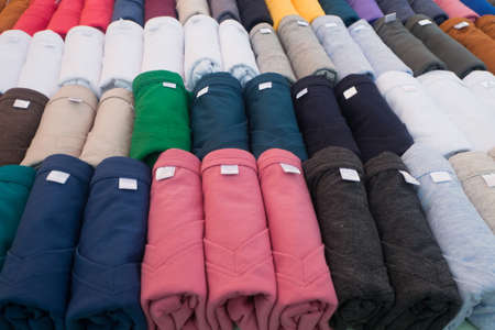 Close up of a group of colorful T-Shirt pack and arranging in suitcase, prepare for travel. A T-shirt is a style of fabric shirt made of a stretchy, light and inexpensive fabric and are easy to clean.