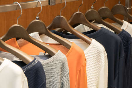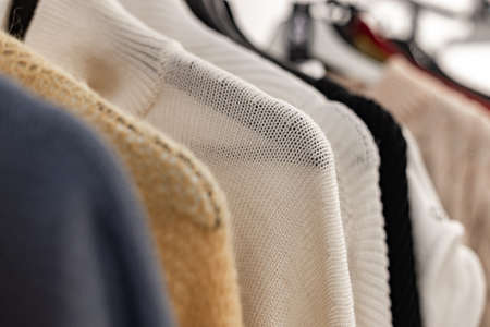 Closeup of woolen pullover collection on hangers in a fashion store showroom