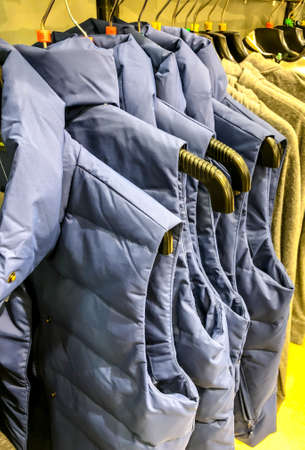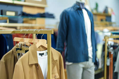 Fashion store, hanger with outerwear jacket coat down jacket trench, trend clothing outlet background
