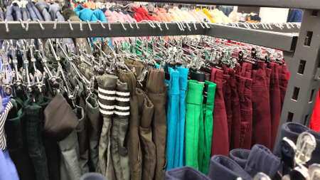 Row of different colorful pants trousers on metall hanger in shop. Close up