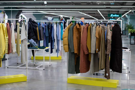 Clothing on display in a boutique store in shopping mall, fast fashion concept