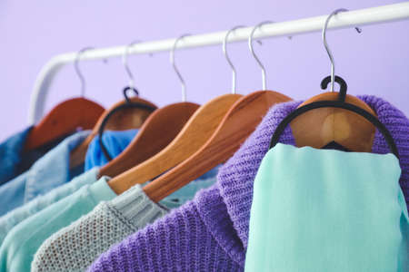 Colored clothes on hangers close up. Clothes hanging on shelf in store. Shopping.