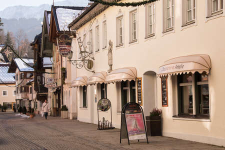 Garmisch-Partenkirchen, Germany - December 22,2021: Street view of the Garmisch-Partenkirchen on sunny winter day.