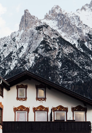 MITTENWALD, GERMANY - DECEMBER 2018: roof of old house with snowcapped Alps mountains on the background. Vertical orientation.
