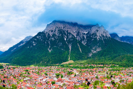 Mittenwald town and Karwendel mountain aerial panoramic view in Bavaria, Germany