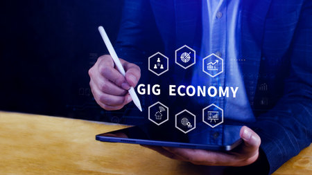 Gig economy. using a smartphone, freelance, hybrid workplace concept. combination of employment trend, growing to external hiring. not ai