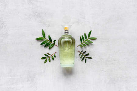 A bottle of perfume on a background of green leaves. The concept of female beauty