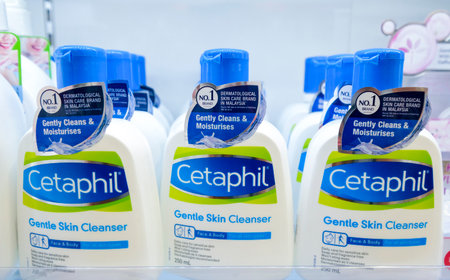 KUALA LUMPUR, MALAYSIA - MAY 30, 2021: Cetaphil products display in retail aisle. Cetaphil is the original sensitive cleanser and gentle skin care products.