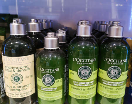 Shampoo setting for dry Aromacology Nutrition L'Occitane en provence shampoo at perfume and cosmetics store on February 25, 2020 in Russia, Tatarstan, Kazan, Pushkin Street 2.