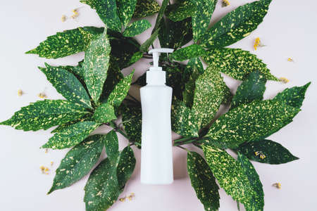 Bottle of white cream lotion on green plant leaf, natural skin care spa concept.