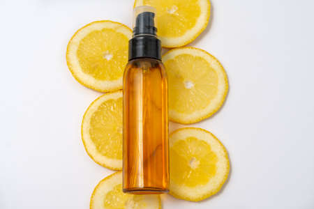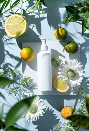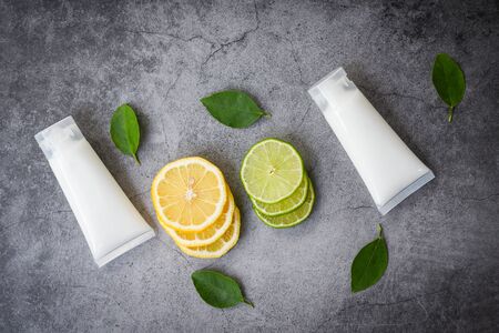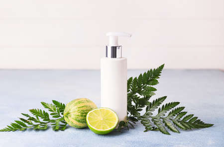 Lotion bottle natural for face and body beauty remedies and organic minimalist lifestyle with lemon lime slice and green leaves herbal formulations , top view
