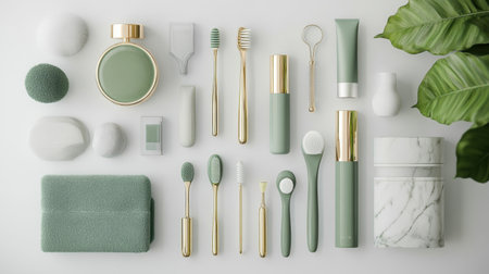 This collection features an elegant arrangement of green and gold bathroom accessories, perfect for personal care and modern home decor, promoting a serene and stylish atmosphere.