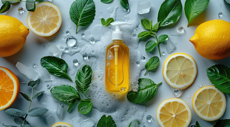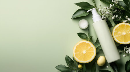 A top-down view of a natural skincare product bottle surrounded by fresh lemon halves and lush green leaves, set against a light green background, emphasizing organic beauty and wellness.
