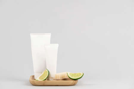 Skincare and bodycare concept. Beauty cosmetics and moisturizing cream in white plastic tubes. Mockup packaging with blank space for logo brand stand on wooden tray in bathroom against gray background