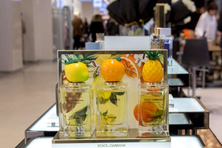 Russia, Moscow, March 07.2020: Kuznetsky Most. Luxury store TSUM. Sale of perfumes. Perfume shop. Dolce and Gabbana. Fruit Collection.