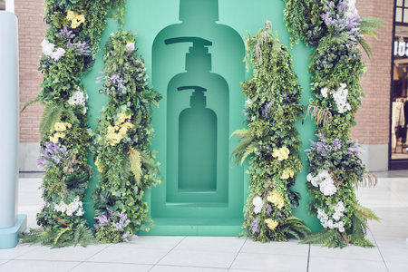 Installation of shampoo for hair with flowers for product demonstration. Concept: template and background design with the ability to copy. High quality photo