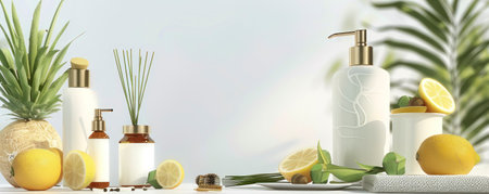 3D render. Vibrant Containers of Tropical Aromatic Body Treatments Amidst Lemongrass and Turmeric, With Tillandsia Adding a Touch of Elegance