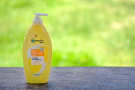 CHIANGRAI,THAILAND-SEPTEMBER 7,2019: Skin care cream brand GARNIER put on wood table with green blur background,copy space