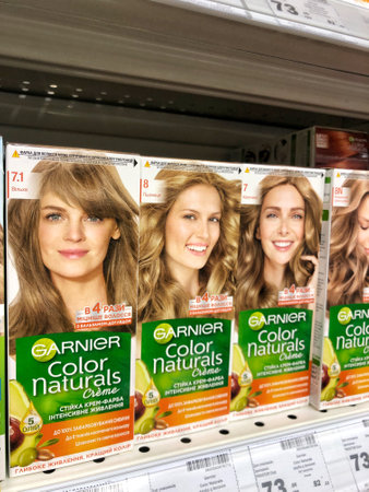 22.01.2023 Ukraine, Kharkiv, cosmetics and hair care store. Large selection of hair dye from different brands. Stand with women's hair dye