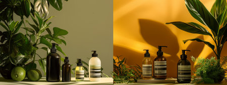 Natural skincare products displayed with lush green plants in a minimalist setting, showcasing the beauty of simplicity and nature, ideal for beauty and wellness themes.
