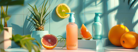 A bright, sunny setup featuring citrus skincare products with fresh grapefruit and oranges, set against a turquoise backdrop. The light, vibrant composition highlights the freshness and natural appeal, ideal for beauty and wellness themes.