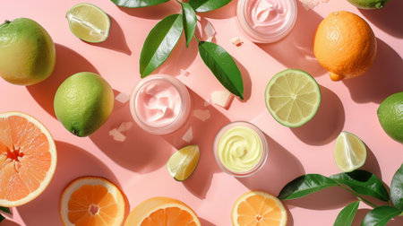 An arrangement of citrus fruits like lime, lemon, and grapefruit alongside jars of skincare creams on a pastel pink background. The fresh, vibrant setup conveys natural beauty and wellness.