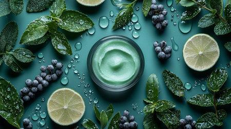 A vibrant display of green skincare products surrounded by fresh limes and mint leaves on a textured background.