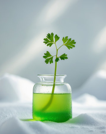 Discover the elegance of nature with this vibrant green bottle surrounded by lush leaves. Perfect for a serene and stylish atmosphere. Generated A.I.