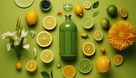 Unlabeled bottle in gradient green color displayed with many kumquat and lime round slices. White towel with a petri dish placed on. Template for branding mockup