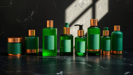 Green bottles on black marble. Row of green cosmetic bottles with copper caps on black marble surface against dark background.