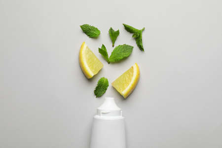 Blank tube of toothpaste with mint and lemon on white background, flat lay