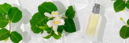 A bottle of perfume in pure waves of water. Flowers and delicate jasmine petals with drops. Flat lay, top view, copy space concept.