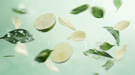 photo of floating lime slices and green tea leaves, advertising art, wallpaper, pastel mint background --chaos 10 --ar 16:9 --style raw --v 6.1 Job ID: 9e624f68-88fe-450f-89e4-5f590cf055cd