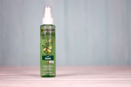 KHARKIV, UKRAINE - DECEMBER 16, 2021: Garnier production with company logo. Garnier Bio collection is under EcoCert, an organic certification organization