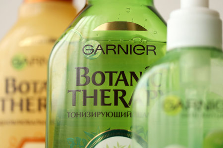 TERNOPIL, UKRAINE - SEPTEMBER 2, 2022 Bottle of Garnier Botanic Therapy Green Tea Shampoo among another Garnier company products close up