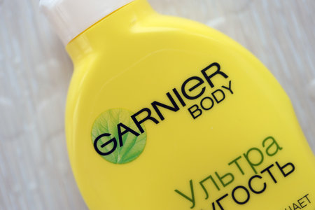 KYIV, UKRAINE - FEBRUARY 27, 2024 Garnier production with company logo on yellow bottle close up
