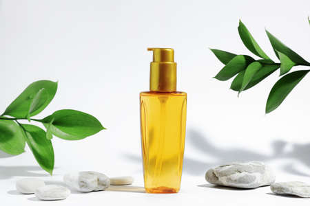 Clear bottle of yellow orange oil for sun protection, tanning or hair. White background with hard shadows, plants and stones. Summer care cosmetics.