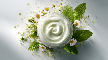 A top-down composition of herbal mint and chamomile cosmetic cream in a glass jar on a soft silver background, surrounded by fresh green leaves and white flowers for a cooling natural beauty look.