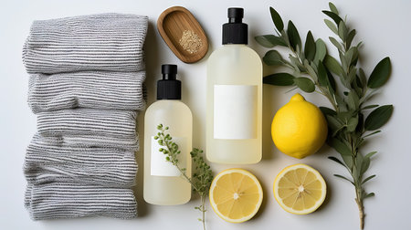 Top view of a skincare cleansing products are displayed on a white background with towels, lemons and herbs.